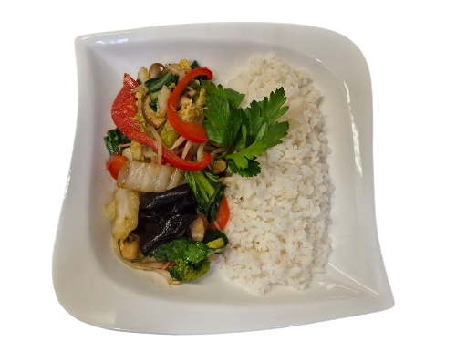 Zubereitet mit Peperoni, Sojasprossen, Brokkoli, getrockneten Judasohren, Chinakohl und Pak Cho